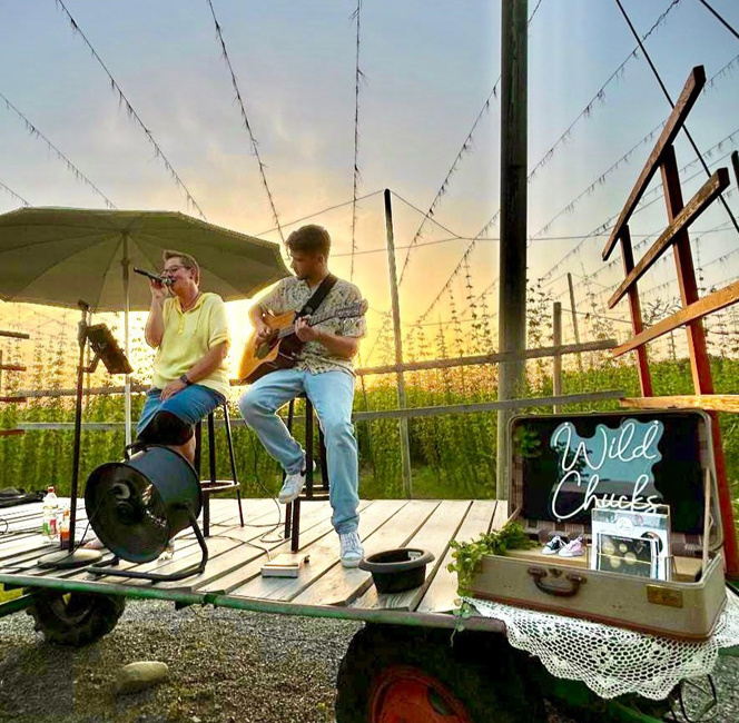 Sonnenuntergang hinterm Hopfengarten, Feines aus der HOPFENGUT Küche auf dem Teller und kühle Getränke im Glas. An diesem Abend nimmt die unplugged Besetzung der Wild Chucks mit Gitarre und Gesang das Publikum mit auf eine musikalische Reise quer durch laue Sommerabende. Wir finden: so klingt der perfekte Feierabend!